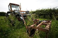 Een oude trekker van het merk British Leyland, type 272, wordt langzaam overwoekerd door brandnetels, distels en roest. Hij moet hier al heel wat jaren staan. Ergens in een weiland in Shropshire, Engeland. De British Leyland tractoren werden gebouwd tussen 1976 en 1984 in Bathgate in Schotland. Dit apparaat is dus minstens 40 jaar oud (foto is van 2024). Oorspronkelijk had de trekker een mooie babyblauwe kleur. Daar is nu weinig meer van te zien. Een trekker met een cabine was in die tijd best wel luxe. De voorlader werd waarschijnlijk gebruikt om voer mee uit een silo te halen of stromest uit de stal.