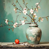 Deze print straalt een klassieke, landelijke ambiance uit. De oude vaas is het middelpunt van de compositie, vergezeld door een weelderige bloesemtak en oranje vrucht, allemaal tegen een achtergrond van levendig turkoois.