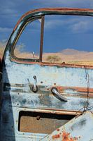 Binnenkant van een kapotte verroeste oude auto deur in de woestijn van Namibie bij het plaatsje Solitaire. Door het raam nog een stukje landschap te zien. Karakteristiek vintage. Verlaten.