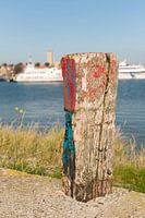 Oude verweerde en fraai gekleurde meerpaal in de haven van West Terschelling in Nederland