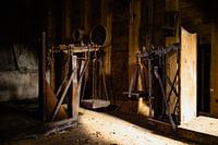 Twee grote industriële weegschalen staan stil in een vervallen kamer. Hun roestige kettingen en verweerde metalen structuren getuigen van een vervlogen tijdperk. Een smalle lichtstraal komt door een spleet en verlicht de weegschalen, waardoor het ruwe, verouderde oppervlak in een warm licht baadt. De weegschalen, die ooit werden gebruikt voor zware ladingen, zijn nu bedekt met stof en spinnenwebben, wat de stille vergankelijkheid van deze plek symboliseert. De houten muren op de achtergrond en de vloer vol sporen van vroegere activiteit versterken de nostalgische sfeer. Dit beeld herinnert aan het harde werk en de geschiedenis die binnen de muren van dit gebouw verborgen liggen.