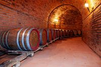 Houten vaten rode wijn opgeslagen in een stenen kluis in Italië