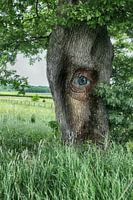 De oude wijze eik,kijkt met een oog naar de wereld. Hij staat in de groene voorjaars- weide