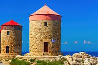 Oude windmolengebouwen met kleurrijke daken. De kade van Rhodos. Griekenland