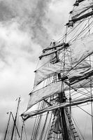 Klassieke zeilschipmasten met zeilen op de IJssel tijdens het Sail Kampen-evenement in 2018. Zwart wit foto met bewolking in de achtergrond.