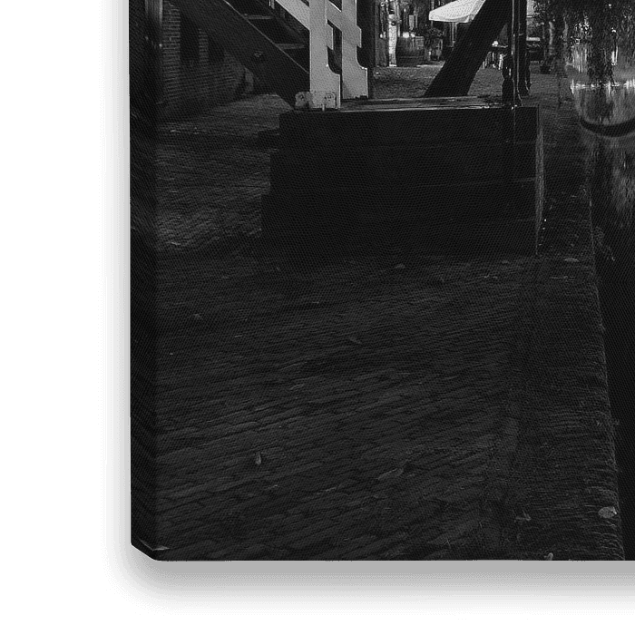Koop de foto Oudegracht in Utrecht tussen Hamburgerbrug en Weesbrug met Domtoren, ZWART-WIT van Donker Utrecht op canvas, aluminium dibond, (ingelijste) fotoprint, behang en ArtFrame, op maat geprint in Fine-Art kwaliteit.