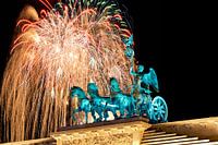 Oudejaarsviering bij de Brandenburger Tor in Berlijn met de Quadriga op de voorgrond en vuurwerk in de lucht erachter van Stefan Dinse