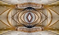 Een digitaal bewerkte compositie van gewelfde plafonds in warme kleuren. De overlapping van 2 tot 4 beeldelementen creëert complexe structuren waarin verschillende gewelven en architecturale details worden gecombineerd. Deze overlays creëren een fascinerend, bijna caleidoscopisch effect waarin de rondingen en bogen van de plafonds harmonieus overlappen en nieuwe vormen creëren. De bruinachtige kleuren geven het beeld een warme, antieke sfeer, alsof de gewelven afkomstig zijn uit oude kerken, kathedralen of historische gebouwen. De dominante vorm in het midden lijkt op een groot oog, bestaande uit stenen boogstructuren en een decoratief glas-in-loodraam als "pupil". De bogen stralen naar buiten, waardoor een illusie van diepte ontstaat, terwijl de warme stenen tinten het beeld een antieke grandeur geven, die mogelijk doet denken aan gotische of romaanse architectuur. De symmetrische spiegeling versterkt het surrealistische, caleidoscopische effect en combineert klassieke architectonische schoonheid met abstracte kunst.