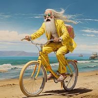 Deze dynamische afbeelding toont een oudere persoon met lang, wit haar en baard die in een felgeel pak op een bijpassende fiets over het strand rijdt. Het pak is versierd met kleurrijke vlindermotieven, wat het uiterlijk een speels en onconventioneel tintje geeft. De persoon draagt een zonnebril en zijn gezichtsuitdrukking is een…