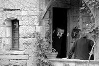 Oudere man heeft bij zijn huis een gesprek met een oudere dame. Sarlat - Frankrijk