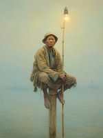 Dit sfeervolle portret toont een oudere man, zittend op een houten paal in het water, met naast hem een eenvoudige lamp die zachtjes oplicht in de mistige omgeving. Zijn verweerde gezicht en doorleefde handen vertellen het verhaal van een leven vol ervaring, geduld en verbondenheid met de natuur. Zijn kleding is eenvoudig en gedragen, passend bij de stilte en soberheid van het tafereel. De mist omringt hem als een zachte deken, waardoor de wereld om hem heen bijna oplost in stilte en licht. De lamp fungeert als een symbool van hoop en richting, een klein baken in de leegte. Het schilderachtige karakter en de warme aardetinten geven het werk een intieme en poëtische sfeer, waarin eenvoud en wijsheid de hoofdrol spelen.