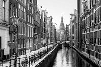 Prachtige opname van de Oudezijds Kolk in Amsterdam in de winter met sneeuw en de Oude kerk op de achtergrond in zwart-wit