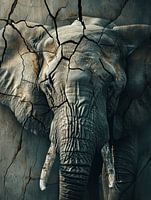 Dit artistieke beeld brengt de grandeur van een olifant tot leven, gevat binnen de breuklijnen van de tijd. De barsten die zich een weg banen door het canvas suggereren een diepe verbinding met de aarde, terwijl de subtiele kleurnuances en lichteffecten de olifant een bijna mythische aanwezigheid geven. Dit werk spreekt van overleven en de natuurlijke cycli van groei en verval, en staat als een sterk symbool voor de olifant als hoeder van oude verhalen en wijsheid.