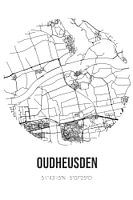 Zwart-witte landkaart, stratenplan of plattegrond van Oudheusden. Oudheusden is gelegen in de gemeente Heusden, provincie Noord-Brabant. Op de stadskaart zijn alle openbare wegen in Oudheusden opgenomen. Verder is de kaart voorzien van de coördinaten van het centrum van Oudheusden.
