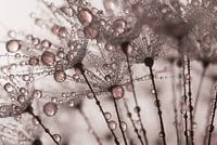 "Oudroze druppeltjes "dansen" met de pluisjes" is een macrofoto van gekleurde (oudroze) waterdruppels op de pluisjes van een paardenbloem van schuin onderaf gefotografeerd. Deze bewerkte foto heeft oudroze, bruine- grijstinten met een heel klein beetje zacht blauw in de weerspiegeling in de druppels.