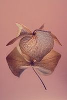 "Oudroze met goudbruin "dansend" hortensiablaadje" is een macrofoto van een eenvoudig hortensiablaadje (een steeltje met vier blaadjes eraan) die gedroogd is door de zon waardoor de nerven heel mooi zichtbaar zijn geworden. Door de gekozen belichting en de spiegelende ondergrond, vind ik het net lijken of het blaadje danst.