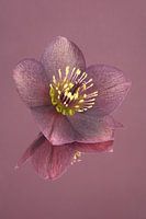 "Oudroze: rust en eenvoud: Stilleven met bloemen: de Helleborus" is een macrofoto van een bloem van de Helleborus (ook wel Kerstroos genoemd). Enkel de bloem van de plant is hier gefotografeerd, liggend op een spiegelend oppervlak. Door deze spiegeling krijgt het beeld iets spannends en aparts. De achtergrond en ondergrond lopen in elkaar over waardoor er een vlak ontstaat zonder horizon lijn. Dit maakt het beeld heel rustig en minimalistisch. Als je inzoomt op de bloem kun je mooi de details zien van dit werk.