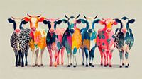 Een kunstwerk van een rij koeien die naast elkaar staan, ​​elke koe heeft een uniek levendige kleurrijk patroon, waaronder abstracte vormen, opvallende bloemmotieven en tropische bladeren. De stijl is speels en fantasierijk en roept een gevoel van vreugde en creativiteit op.