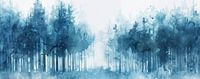 Dit aquarelkunstwerk toont een prachtig blauw getint boslandschap dat gehuld is in een mysterieuze nevel.