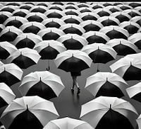 Een vrouw loopt onder een paraplu tussen duizend anderen