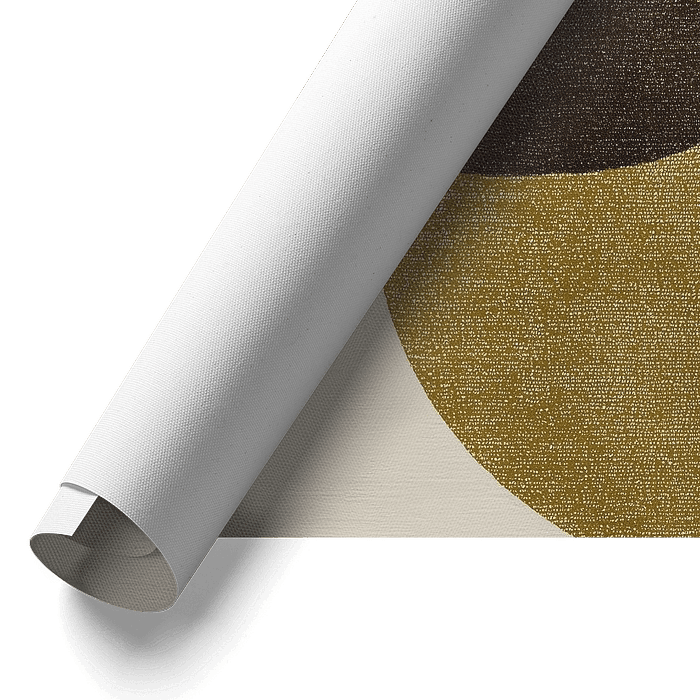 Twee grote, overlappende ovalen in taupe en goud creëren een sereen beeld dat moeiteloos past in een modern interieur. De vlakke weergave, zonder storende elementen of achtergrond, benadrukt de eenvoud en het ritme van het patroon. Geïnspireerd op een wollen tapijt, straalt dit kunstwerk warmte en verfijning uit – zonder opdringerig te…