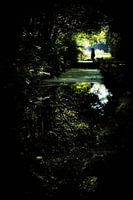 Een wandelaarster loopt met haar hondje over een bruggetje in het Purmerbos in Purmerend. Het Purmerbos in op dit moment het enige grote bos en recreatiegebied in deze gemeente. Er zijn wandel- en fietspaden, slootjes, bruggetjes, en verschillende aparte bosgebieden. Hier is de wandelaarster van achteren verlicht, en ook nog een beetje te zien in het water van de sloot. De sloot zelf is omringd met bos zodat deze nogal verduisterd is.