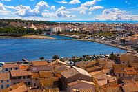 Uitzicht over de daken van de prachtige oude middeleeuwse havenstad in Zuid-Frankrijk Gruissan aanvulling op de Middellandse Zee.