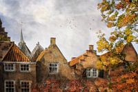 Tussen het goud en rood van de bladeren lichten de daken van de oude huisjes zacht op. Het beeld fluistert stilte, omarmd door de warme herfstkleuren.
