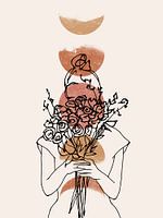De afbeelding toont een vrouw, lijntekening, die delicaat een boeket bloemen vasthoudt dat sierlijk haar gezicht verbergt. De achtergrond bestaat uit abstracte terracotta maanfasen, die een vleugje artistieke diepte toevoegen aan de compositie. Het geheel is een harmonieuze mix van eenvoud, vrouwelijkheid en hemelse elementen.