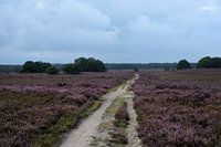 Deze foto heb ik gemaakt op de Ermelosche heide. Deze heideveld licht op de Veluwe op een stuwwal die in de voorlaatste ijstijd is gevormd. Op deze foto zie je niet alleen een pad over de heide maar ook een aantal loofbomen zoals de berk. Deze foto heb ik tussen de buien door gemaakt, je ziet de bewolking nog hangen.