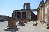 Overblijfselen van de basiliek in de oude stad Pompeii, Italië. De basiliek, met een oppervlakte van 1.500 vierkante meter, was het weelderigste gebouw van het Forum en de ruimte werd gebruikt om zaken te doen en voor de rechtspraak. Het is toegankelijk vanaf het Forum via vijf ingangen, gescheiden door tufstenen pilaren; binnenin is…