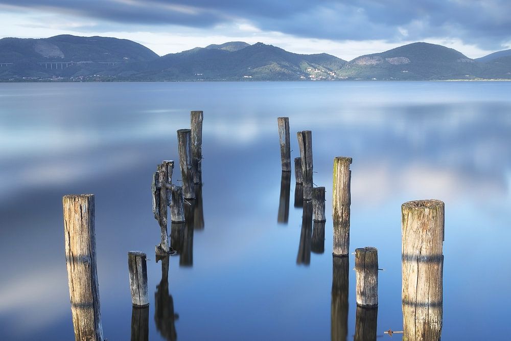 Koop dit landschapskunstwerk Overblijfselen van houten pier. Meer Massaciuccoli van Stefano Orazzini op canvas, aluminium dibond, (ingelijste) fotoprint, behang en ArtFrame, op maat geprint in Fine-Art kwaliteit.
