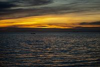 Een diepblauw zeeoppervlak vangt de laatste warme kleuren van de dag bij Wongamat Beach, Pattaya. In de verte glijden boten stil door het water, terwijl de lucht overgaat van goud naar nachtblauw — een moment van pure rust.