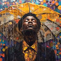 "Overgave" vangt het moment waarop een prachtige man onder een paraplu staat, omgeven door een regenbui. Zijn houding is zelfverzekerd, met zijn hoofd opgeheven en zijn ogen gesloten, alsof hij de regen verwelkomt met open armen. De omgeving is doordrenkt van levendige kleuren, wat een contrast vormt met de somberheid van de…
