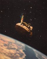 Surrender toont een fascinerend en surrealistisch beeld - een astronaut die op een brandende rots ligt, verloren in de stille uitgestrektheid van de ruimte. Het contrast tussen het vurige aardse element en de koude leegte van de kosmos resulteert in een visueel adembenemend en emotioneel aangrijpend tafereel. Op de achtergrond is de aarde een ontroerende herinnering aan zowel thuis als eenzaamheid.