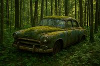 Een verweerde, met mos begroeide oldtimer staat stil in een dichtbegroeid bos, een stille getuige van vergane glorie. De combinatie van roest, groen en zacht invallend licht creëert een magische sfeer waarin natuur en verleden samenkomen.
