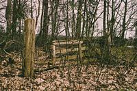 Vervallen houten hek overgroeid door een bos met jonge bomen, ontluikend in de lente