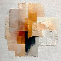 Een abstract kunstwerk met een compositie van overlappende textuur vlakken in zachte tinten. De textuur varieert, sommige lijken glad, terwijl andere grof zijn, wat een gelaagd effect creëert op een witte canvas achtergrond.