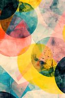 Dit abstracte kunstwerk bestaat uit overlappende cirkels in diverse kleuren en tonen, waardoor een dynamisch en rijk gelaagd beeld ontstaat.