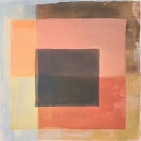 Overlappende Vierkanten | Quiet Color Harmony - Dit abstract schilderij toont een compositie van overlappende vierkanten en rechthoeken in rustgevende tonen van oranje, beige en een diep donkerbruin, die samen een gelaagd en harmonisch geheel vormen.