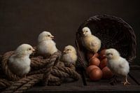 Een vijftal kuikens lijkt te overleggen waar en hoe verder. De mand met eieren is omgevallen, wachten ze nog op de rest? Een stilleven in oude fine art stijl met dieren, vijf net geboren kuikens.