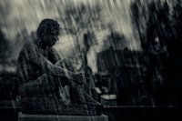 Zwart/wit, beeld in de regen, gefotografeerd op een begraafplaats in Belgie. De denkende mens in overpeinzing op het graf van een dierbare.