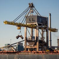Wat zien we op deze haven foto. Een grote hijskraan een machtige grijper. Het dek van een bulkcarrier en de kade van een fabriek in een haven. De dekluiken en de gangboorden.