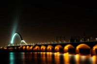 Brug De Oversteek over de rivier de Waal in Nijmegen. Nachtopname. Hoog water.