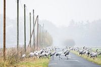 Overstekende kraanvogels in het buiten gebied van Diepholz. Diepholz in Duitsland is één van de trekpleisters om kraanvogels te zien. Dit was een rustig landweggetje in the middle of nowhere. Massaal stonden de kraanvogel op en langs de weg, een prachtig gezicht. De foto is omgezet naar zwart-wit.