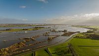Varend schip op de IJssel bij Zalk in het herfstige ochtendlicht met hoge waterstand in de uiterwaarden bij Zwolle na langdurige regen stroomopwaarts. Hoog uitzichtpunt over de rivier en dijken.