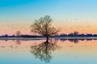 Zonsondergang in de Elbe uiterwaard, overstroming, Elbe uiterwaard biosfeerreservaat, Nedersaksen, Duitsland