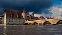 Overstromingswater bij de Stenen Brug in Regensburg, Beieren