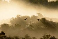 De opname is gemaakt tijdens een mistige ochtend in de Amsterdamse Waterleidingduinen. Door de mist ontstond er een magische sfeer. Ik stond op de hoogste berg in de AWD en zag deze ganzen overvliegen door de mistflarden en de opkomende zonnestralen.
