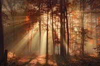 Mooie zonnestralen stralen in een mistig herfstachtig bos in Nederland.